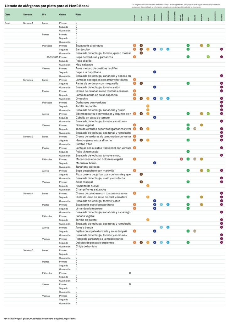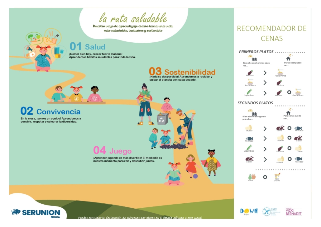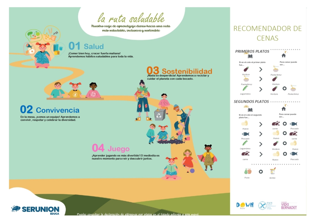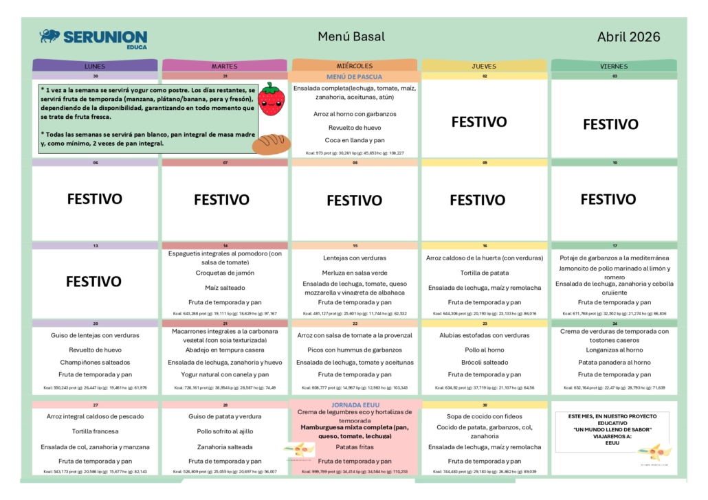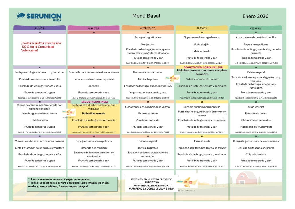 El comedor tiene cocina propia totalmente equipada. La empresa a cargo del comedor es SERUNION. Todos los menús son elaborados íntegramente en nuestras instalaciones y cumpliendo los máximos estándares de calidad, salubridad y trazabilidad, siguiendo las indicaciones de una nutricionista profesional para que sean equilibrados y variados. También contamos con menús para alumnos con necesidades alimenticias especiales (alérgicos, celíacos, dietas blandas…).